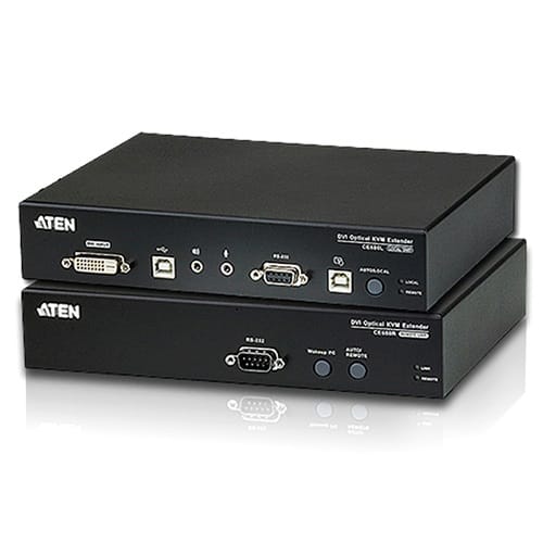 ATEN CE680 DVI Optical KVM Extender The CE680 is a DVI Optical KVM Extender that overcomes the length restriction of standard DVI cables by using optical fiber to send high definition audio, video and control signals over long distance. It accepts audio-video stream from a local source and serializes the data to pass over a single 3.125 Gbps optical link (for resolutions up to 1920 x 1200 @ 60Hz, 24-bits). It can also extend the keyboard/mouse remote control signals, as well as transfer RS-232 signals (up to 115 kbps) in both directions, allowing you to connect serial devices, such as barcode scanners. A USB port on the local and remote unit’s rear panel lets you connect a USB touchscreen panel device, which can access to a computer connected at the local site. The CE680 allows access to a computer system from both local and remote consoles (USB keyboard, monitor, and mouse). Furthermore, the CE680 takes advantage of fiber optic cable technology for connecting the local and remote units, providing easy and quick installation and long-range extension of DVI signals.