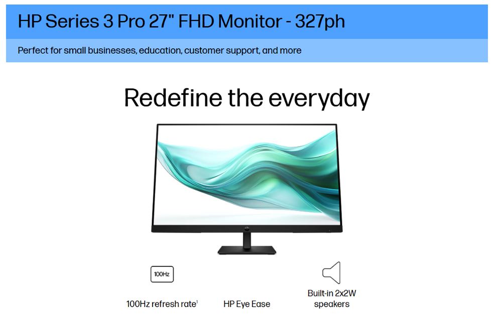 HP 327PF 27′ 100Hz IPS FHD Business Monitor Anti-Glare 1920×1080 16:9 5ms Tilt Height Adjustment Slim Bezel Low Blue Light HDMI VGA DP Speaker VESA