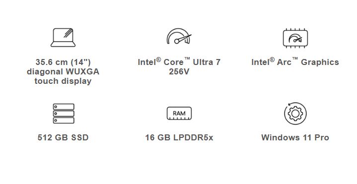Processor Intel® Core™ Ultra 7 256V (up to 4.8 GHz with Intel® Turbo Boost Technology, 12 MB L3 cache, 8 cores, 8 threads)15,16