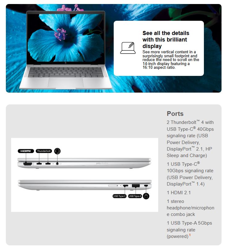Ports 2 Thunderbolt™ 4 with USB Type-C® 40Gbps signaling rate (USB Power Delivery, DisplayPort™ 2.1, HP Sleep and Charge)