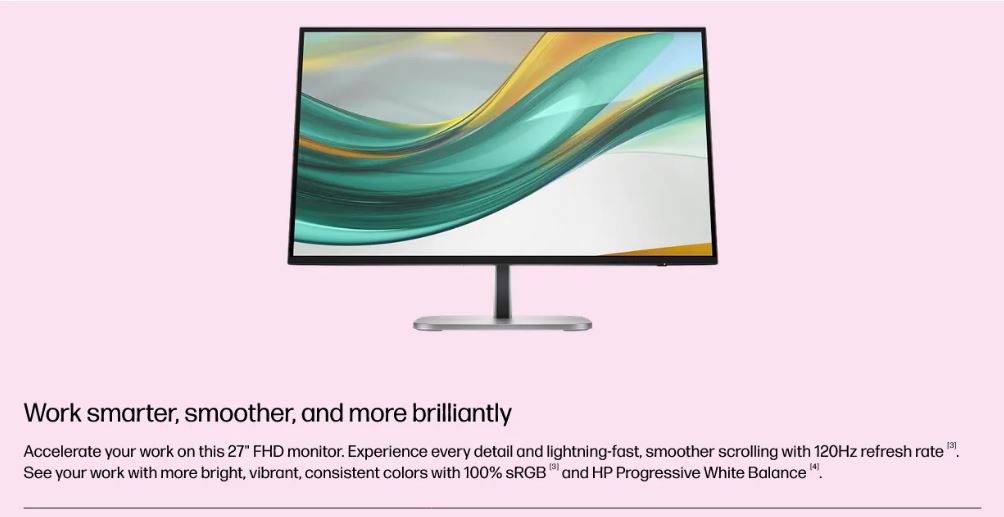 HP Series 5 Pro 527PF 27′ 120Hz FHD IPS Monitor Anti-Glare 1920×1080 16:9 5ms Height Adjustment Tilt Swivel Pivot DP HDMI 4xUSB-A 3yrs