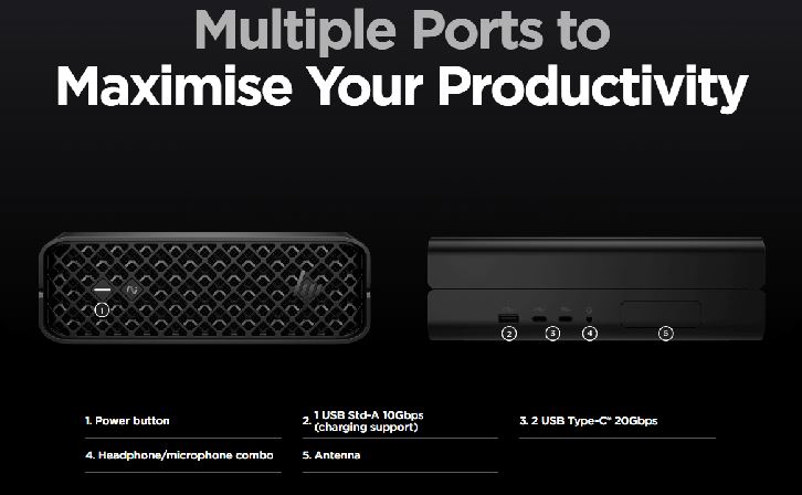 Ports 2 USB Type-C® 20Gbps signaling rate; 1 headphone/microphone combo; 1 USB Type-A 10Gbps signaling rate (1 charging)