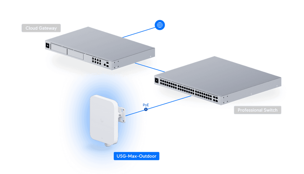 A full-performance 5G (3.4 Gbps) modem for UniFi consoles and Cloud Gateways, designed for outdoor use with directional antennas, remote SIM, and dual SIM for seamless failover.